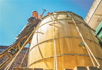 11月10日,江西省新余市渝水区水北镇公塘村,制鼓匠人谢歌美正在钉鼓钉。牛皮鼓,又称堂鼓、喜庆鼓,多用于江南祠堂内婚嫁迎娶和迎新年等。牛皮鼓的制作有数十道工序,包括处理牛皮、刨制鼓腔、蒙皮、拉皮、钉钉,每道工序都要考验着手艺人的技艺和耐心。