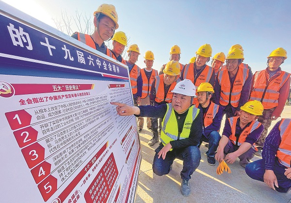 11月15日,中铁十七局三公司安庆高铁新区项目党支部书记韩嵘,正在给党员解读十九届六中全会相关精神。