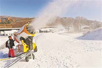 11月15日,工作人员操作造雪机在张家口赛区国家越野滑雪中心进行造雪作业。