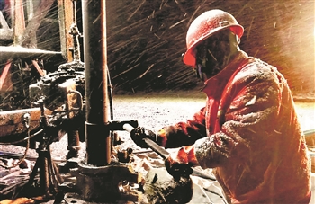 11月3日,河南油田油服中心作业大队西部项目部XJ216队员工在 K424-31H井顶风冒雪进行作业。