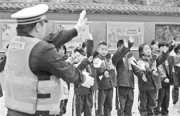 11月16日,张家界市武陵源区协合乡中心学校学生在民警的引导示范下,学习交通指挥手势。当日,湖南省张家界市武陵源区交警部门组织民警前往农村地区学校开展道路交通安全宣传活动,重点讲解学生上、下学期间的道路交通安全常识和事故预防知识,提高学生交通安全意识。新华社记者 吴勇兵 摄