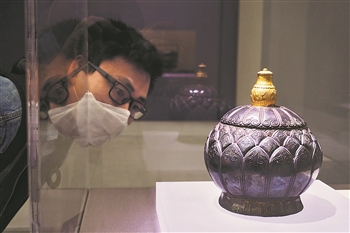 本次特展展出的文物涵盖了不同年代的陶瓷、玉石印鉴、金属制品、书画善本、钱币等多个类别,浓缩了数千年来在杭州这片土地上的历史、文化、生活等风貌与变迁,吸引不少市民游客前来观看了解杭州这座千年古都的前世今生。图为观众在观看明代“鎏金钮莲瓣纹银盖罐”。
