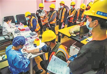 11月20日,由陕西省总工会主办、省建设工会承办的“当好娘家人 服务建设者”万名农民工免费体检公益活动走进中建二局三公司西北分公司承建的西安曲江文创中心项目工地,来自西安市国际医学中心的医护人员给200多名建筑工人免费体检。本报通讯员 袁景智 摄