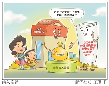 辽宁省教育厅等九部门近期印发《辽宁省校外机构预收费资金监管工作指引(试行)》,要求将面向中小学生(含幼儿园儿童)的各类校外培训机构全部纳入预收费资金监管范围,严防“退费难”“卷钱跑路”等损害群众利益的问题发生。