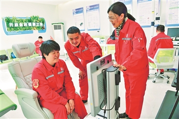 在主要油气生产单位一线站点,中原油田设置多处职工健康驿站,让医疗服务走到职工身边。健康驿站不仅设有“健康自测区”,提供各种医疗检测设备,还配备了紧急医疗箱、担架等急救设备,为职工提供健康检测和医疗救治服务。职工可以在这里刷脸进行“自助”操作,检测结果即时形成体检报告,并可在电脑、手机上看到。本报通讯员 仝江 摄