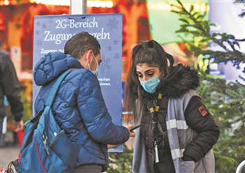 11月22日,在德国法兰克福圣诞市场外,一名工作人员检查市民的健康通行证。受新冠疫情影响,德国柏林、法兰克福等地的圣诞市场有的取消,有的在较为严格的防疫措施下开放。新华社记者 逯阳 摄