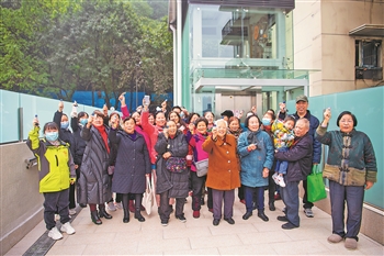11月24日,中山二路社区居民在“阳光电梯”上出入口处高举电梯卡合影。