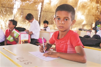 11月24日,学生在也门哈杰省一所学校的临时教室内学习。这所学校的大部分教室在战乱中被炸毁,200多名学生只能在帐篷、茅草屋或木板房内上课。新华社发(阿尔瓦菲 摄)