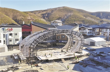 11月27日,工人在太子城冰雪小镇颁奖广场搭建舞台(无人机照片)。