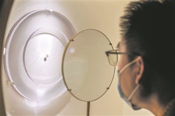 一名观众正在观察一粒炭化稻米展品,这粒炭化稻米,粒长3.732毫米、粒宽1.667毫米、粒厚1.723毫米,长宽比值2.239。