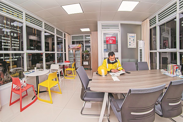 日前,山东省济宁市任城区首家24小时自助服务户外驿站正式运行,提供“不打烊”服务。该驿站每天晚间由门禁系统和智能化设备进行管理,新就业形态劳动者通过“齐鲁工惠”APP会员二维码即可开门并享受自助服务。图为一位外卖骑手晚间在此学习“充电”。本报记者 田国垒 摄