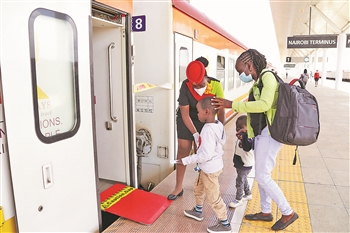 11月17日,在肯尼亚蒙内铁路内罗毕站,乘务员西尔维娅·齐巴拉克帮助小朋友上车。