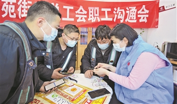 11月30日,在北京市丰台区南苑街道总工会职工沟通会现场,工会工作人员为网约车司机办理加入工会手续。
