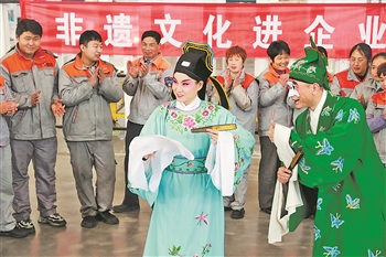 11月26日,山东省高密市艺术剧院的茂腔传承人为豪沃机械科技有限公司的职工表演茂腔经典曲目。近日,高密市总工会举行“非遗文化进企业”活动,邀请茂腔传承人来到当地企业,通过戏曲演出等形式,让职工感受传统文化的魅力。本报记者 田国垒 本报通讯员 李海涛 摄