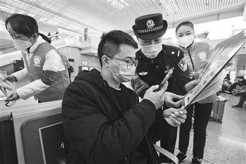 2021年以来,南京铁路公安处南京南站派出所积极组织辖区内商户,打造一支“平安志愿者”队伍。这支队伍通过做好小隐患排除、小纠纷化解、小线索提供,成为建设平安南京南站的重要群众力量。图为11月25日,在南京南站候车大厅,民警和志愿者在对旅客进行反诈宣传。新华社记者 季春鹏 摄