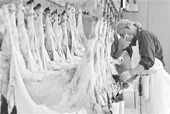 12月1日,在位于都安瑶族自治县的广西澳都农牧科技有限公司新型全自动化冷链加工中心,工人在屠宰车间加工羊肉。