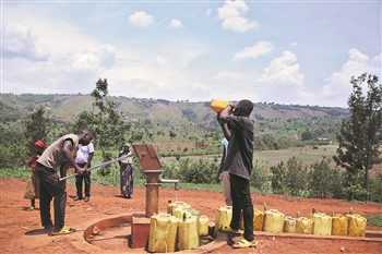 10月14日,在卢旺达东方省恩戈马地区,村民从中国援建水井里打水。