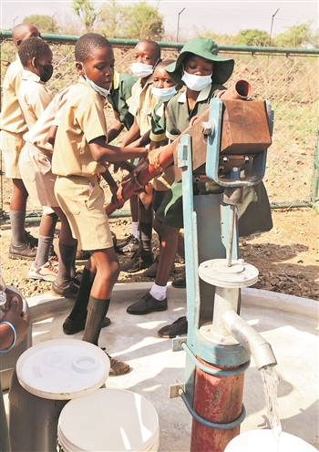 11月3日,在津巴布韦南马塔贝莱兰省省会关达的塞农多小学,学生从中国援建水井里打水。新华社发(陈雅琴 摄)