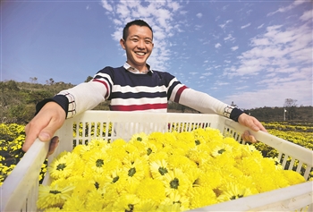 图为在党员示范带动下,清镇市流长苗族乡油菜村群众,捧起丰收的菊花。胡蓝月 摄