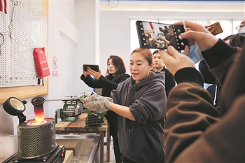 11月26日上午,北京电子科技职业学院,非遗花丝镶嵌传承人钮冬蕊(左二)为该校教师培训。