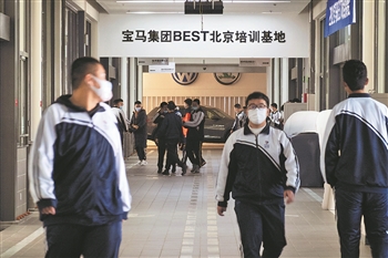 11月25日,北京市昌平职业学校,中德汽车教育文化交流中心宝马集团BEST北京培训基地,课间学生们在走廊里活动。