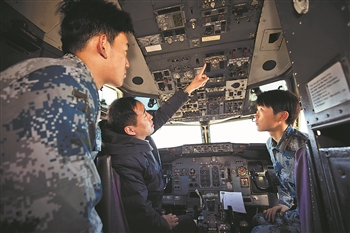 11月26日上午,北京电子科技职业学院教师刘志军(左二)在波音737-300飞机上给学生们上课。