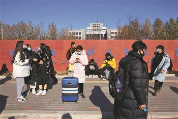 11月26日,星期五,北京电子科技职业学院外的学生们拿着行李准备回家度周末,他们中大部分都是北京本地学生。