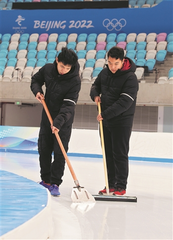 12月1日,国家速滑馆,北京电子科技职业学院机电工程学院冬供热通风与空调工程技术专业的学生正在冰上作业。