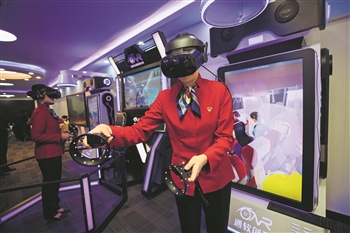 11月25日,北京市昌平职业学校,航空服务专业二年级学生正在上客舱服务课程,用VR模拟体验航空应急撤离场景。