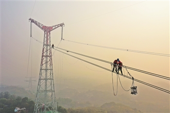 冬日,长江重庆江津段上空近百米,江风凛冽,工人们踩在摇晃的输电导线上,每天连续高空作业近6个小时。 新华社记者 刘潺 摄