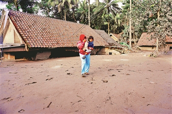 12月5日,在印度尼西亚东爪哇省卢马姜,一名抱着孩子的女子站在被火山喷发物掩埋的房屋前。