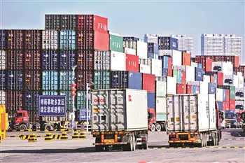 12月7日,在山东港口青岛港,运输集装箱车辆从堆积的集装箱旁经过。