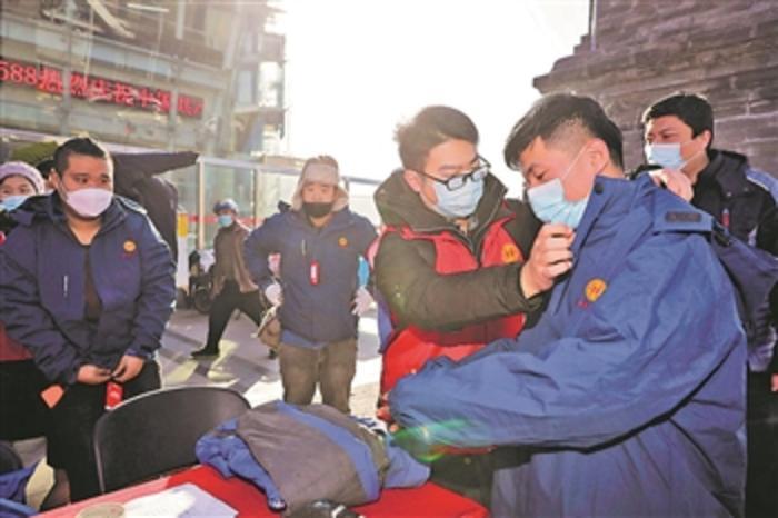 12月7日,天津市河北区总工会开展慰问活动,为辖区内的快递小哥送去冲锋衣、围脖、手套等生活用品,并现场宣传加入工会的好处,提升他们的获得感、幸福感、安全感。图为快递员试穿冲锋衣。本报通讯员 沈岳 摄