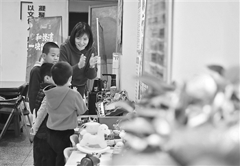 12月4日,张洁(右一)在“村童妈妈聚乐部”教小朋友演唱歌曲《爱的鼓励》。