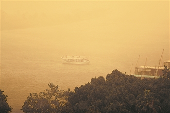 12月8日,在埃及首都开罗,一条客船在沙尘笼罩中的尼罗河上行驶。当日,大风沙尘天气袭击埃及首都开罗,城市能见度较低。新华社记者 隋先凯 摄