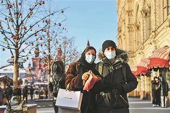 12月11日,人们戴着口罩走在俄罗斯莫斯科街头。俄罗斯防疫指挥部12日发布的疫情数据显示,俄罗斯累计新冠确诊病例超过1000万例。新华社发(叶甫盖尼·西尼岑 摄)