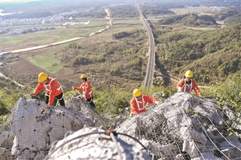 入冬以来,江西昼夜温差大且天气持续晴朗干燥,石灰石易风化松动,该养修工区的12名工人加大了危石隐患排查力度,以确保动车组行车安全畅通。