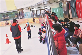12月10日,在北京国贸溜冰场一角,家长们站在场外观看孩子学习滑冰。据了解,随着北京冬奥会临近,来这里学习滑冰的孩子越来越多。本报记者 吴凡 摄