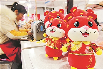 12月15日,河北省邯郸市广平县十里铺镇一家玩具企业工人在加工“唐装虎”毛绒玩具。