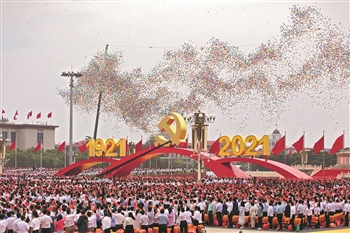 7月1日上午,庆祝中国共产党成立100周年大会在北京天安门广场隆重举行。这是庆祝大会现场放飞气球。