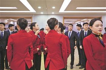 11月25日,北京市昌平职业学校,航空服务专业一年级学生在礼仪课前整理仪容仪表。随着国家对技能人才需求的增强,越来越多的职教生成为就业市场的香饽饽。