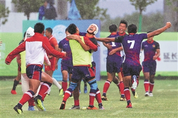9月18日,陕西西安,第十四届全运会男子七人制橄榄球铜牌战在雨中进行,东道主陕西队力克天津队,获得铜牌。比赛结束后,陕西队的队员们在场上飞奔庆祝。