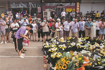 7月28日,河南郑州,沙口路地铁站外,群众自发送来鲜花,以此表达对在“7·20”特大暴雨灾害中不幸遇难同胞的哀思。此次暴雨造成郑州地铁5号线14人遇难。