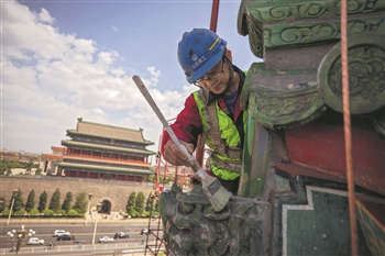 5月26日上午,北京正阳门箭楼修缮期间,席红军师傅正在用刷子清扫屋檐上的灰尘。