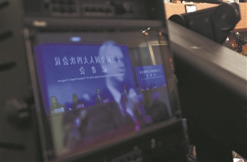 3月7日,在全国两会上,转播屏幕上显示的法新社记者向国务委员兼外交部长王毅提问的画面。当天,王毅就“中国外交政策和对外关系”相关问题回答中外记者提问。