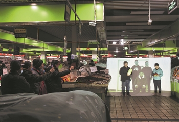 2月2日,工人日报摄影部记者在北京一菜市场为打工者拍摄别样全家福合影,其他商户在一旁围观。春节前夕,我们给响应号召在北京就地过年的人拍摄别样全家福,通过投影的方式让他们在自己的工作岗位上与家人隔空合影。