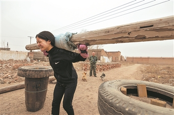 3月17日傍晚,内蒙古呼和浩特市土默特左旗,郑国花在家门口用父亲做的杠铃做蹲起训练。国花和爸爸的“跑步梦”感动了很多人,被称为中国版《摔跤吧,爸爸》。