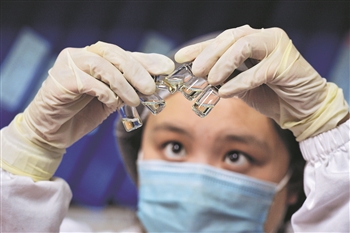 1月12日,北京,新冠疫苗生产企业科兴中维的工作人员在恒温实验室内检测适宜长菌的培养基状况,进行新冠疫苗灌装无菌挑战实验,以此来确保灌装生产符合要求。