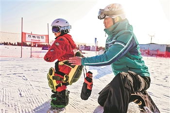 12月14日,在北京延庆的石京龙滑雪场,滑雪教练朱云鹏(右)在教一名小朋友学习单板滑雪。2019年朱云鹏回到老家延庆经营民宿,平时和妻子在延庆的山脚下一起打理小院儿。北京2022年冬奥会为延庆带来前所未有的机遇,朱云鹏“嗅”到了“商机”,特地考取了“中国社会体育指导员证书(一级)”,获得了当滑雪教练的资质。新华社记者 彭子洋 摄
