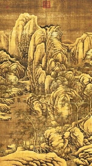 此画着力表现了大山峻岭寒冬时日的清冷寒寂,整幅画作的构图为高远格调,着墨严谨、细致且多变。深山古树之间,溪流潺潺,瀑布有声,高低远近的山坳里,宫室、屋宇错落有致,盘旋的山路蜿蜒,行人徐行于小桥之上,山溪、古树,以及院屋有机融合,尤其是小桥上的行人,让冬日荒寞的深山高岭呈现出灵动的生机。
